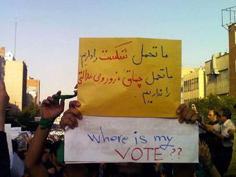 | Keywords: Tazahorat sabz (13).JPG Protest demonstration against election results 7th Tir thru Karimkhan to Vali Asr Sq and beyond Tehran Sign reads We can take defeat in the election What we can't tolerate is batons bullying and injustice myself on behalf of photographer Saba The photographer nicknamed Saba wishes to remain anonymous I have permission from photoghrapher to upload to WikiCommons under PD license Contact me for verification Protests relating to the Iranian presidential election 2009 from 7th Tir to Vali Asr Tehran |