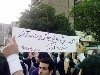 | Keywords: Tazahorat sabz (23).JPG Protest demonstration against election results Vali Asr Sq Tehran Sign reads Chaos and conflict benefits nobody We will obtain our rights with calm Mousavi supporters myself on behalf of photographer Saba The photographer nicknamed Saba wishes to remain anonymous I have permission from photoghrapher to upload to WikiCommons under PD license Contact me for verification Protests relating to the Iranian presidential election 2009 from 7th Tir to Vali Asr Tehran | ||||