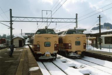 | Keywords: Tazawa limited express at Kakunodate.JPG Two units of the Limited Express train Tazawa stopping at Kakunodate Station 角館駅に 車する特 たざわ own Hahifuheho 1996-02-17 cc-zero 1996 in rail transport in Japan JNR 485 JR East Kakunodate Station Tazawa train |