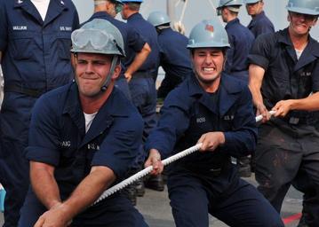 Keywords: teamwork sailors coordinated work ship lines rope crew aircraft carrier military seamen task effort usa
