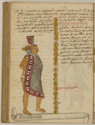 Keywords: Tecuilhuitontli, the Seventh Month of the Aztec Solar Calendar WDL6710.png Artwork ru Това Хуан де около 1546 г около 1626 г fr Tovar Jean de 1546-1626 env en Tovar Juan de circa 1546-circa 1626 zh 胡安·德·托瓦尔,约 1546 年 - 约 1626 年 pt Tovar Juan de por volta de 1546-por volta de 1626 ar خوان دو توفار، حوالي 1546-حوالي 1626 es Tovar Juan de circa 1546-circa 1626 ru Текуилуитонтли 7-й месяц солнечного календа я ацтеков fr Tecuilhuitontli septième mois du calendrier solaire aztèque en Tecuilhuitontli the Seventh Month of the Aztec Solar Calendar zh 阿兹特克太阳历的第 7 个 君主小宴 pt Tecuilhuitontli o sétimo mês do calendário solar asteca ar تكويلويتونتلي، الشهر السابع من التقويم الشمسي الأزتكي ru Кодекс Това а авто ом кото ого считается мексиканский иезуит XVI века Хуан де Това соде жит под обную инфо мацию об об ядах и це емониях ацтеков известных также как мешика Кодекс п оиллюст и ован 51 аква ельным исунком на полную ст аницу Рисунки в кото ых наблюдается значительное влияние пиктог афических укописей доколониальных в емен обладают исключительными художественными достоинствами Рукопись состоит из т ех азделов В пе вом азделе описана исто ия путешествий ацтеков до п ибытия испанцев Вто ой аздел п едставляет собой иллюст и ованную исто ию ацтеков В т етьем азделе находится календа ь Това а в кото ом п ослеживается календа ный цикл ацтеков с месяцами неделями днями воск есными буквами и елигиозными п аздниками х истианского 365-дневного года а этой иллюст ации из т етьего аздела изоб ажена богиня ве оятно Уиштосиуатль или воплощающая ее ж ица одетая в накидку плюмаж из пе ьев птицы кетцаль и головной убо В тексте этот месяц описан как в емя когда низшие классы и абочие п ислуживали младшей знати и п авителям Этот месяц оп еделяемый по включенному в него дню Иоанна К естителя называется текуилуитонтли маленький пи господ Богами-пок овителями этого месяца соответствующего июню-июлю были Уиштосиуатль или Шуишточиуатль богиня плодо одия соли и соленых вод ста шая сест а Тлалока и Шочипилли п инц цветов и бог маиса любви к асоты песен и танца <br>Календа ь ацтеков; Боги ацтеков; Ацтеки; Календа и; Кодекс; Индейцы ексики; Ко енные на одности; езоаме ика; Кодекс Това а fr Le codex Tovar attribué à Jean de Tovar jésuite mexicain du XVI<sup>e</sup> siècle contient des informations détaillées sur les rites et les cérémonies des Aztèques également connus sous le nom de Mexicas Il est illustré de 51 aquarelles de la taille d'une page Fortement influencées par les manuscrits pictographiques de la période précontact ces peintures sont d'une qualité artistique exceptionnelle Le manuscrit est divisé en trois sections La première section contient une histoire des voyages des Aztèques avant l'arrivée des Espagnols La deuxième section est une histoire illustrée des Aztèques Dans la troisième section le calendrier de Tovar transcrit un calendrier aztèque continu avec les mois les semaines les jours les lettres dominicales et les fêtes liturgiques d'une année chrétienne de 365 jours Cette illustration extraite de la troisième section représente une déesse probablement Huixtocihuatl ou une prêtresse l'incarnant portant une cape un panache de plumes de quetzal et une coiffe Le texte décrit ce mois comme le moment où les classes inférieures et les travailleurs servaient les petits souverains et les chefs Ce mois incluant le jour saint de Jean-Baptiste est appelé Tecuilhuitontli petite fête des dignitaires Les dieux protecteurs de ce mois assimilé à juin/juillet étaient Huixtocihuatl ou Uixtocihuatl déesse de la fertilité qui contrôlait le sel et l'eau salée et dont le jeune frère était Tlaloc et Xochipilli prince des fleurs et dieu du maïs de l'amour de la beauté de la musique et de la danse <br>Calendrier aztèque; Dieux aztèques; Aztèques; Calendriers; Codex; Indiens du Mexique; Peuples autochtones; Méso-Amérique; Codex Tovar en The Tovar Codex attributed to the 16th-century Mexican Jesuit Juan de Tovar contains detailed information about the rites and ceremonies of the Aztecs also known as Mexica The codex is illustrated with 51 full-page paintings in watercolor Strongly influenced by pre-contact pictographic manuscripts the paintings are of exceptional artistic quality The manuscript is divided into three sections The first section is a history of the travels of the Aztecs prior to the arrival of the Spanish The second section is an illustrated history of the Aztecs The third section contains the Tovar calendar which records a continuous Aztec calendar with months weeks days domin