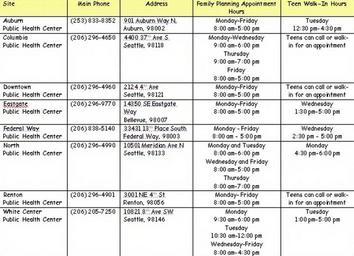 Keywords: Teenclinichours.JPG en A chart showing the hours of Teen Clinics in King County Washington State own Celia Thomas 2010-05-01 BadJPEG Tables information Diagrams in English