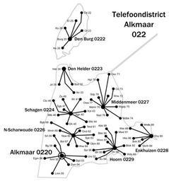 | Keywords: Telefoondistrict alkmaar ca 1952.svg en Schematic map of Dutch PTT telephone district Alkmaar 1950s nl Schematische kaart van telefoondistrict Alkmaar jaren 1950 In Alkmaar bevindt zich de districtcentrale die verbonden is met 8 knooppuntcentrales een ervan in de districtscentrale Deze zijn op hun beurt weer verbonden met de eindcentrales waarop de abonnees zijn aangesloten Own Pbech 2008-11-07 Maps of North Holland Telephone area code maps of the Netherlands | ||||
