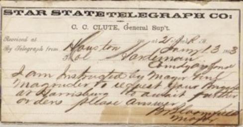 | Keywords: Telegrama, 1869.jpg pt Telegrama da Start State Telegraph Co Acervo do Museu da Imigração de Santa Bárbara d'Oeste SP Brasil http //www santabarbara sp gov br/museu/index php pag acervo Star State Telegraph Co 1869 Museums in São Paulo Santa Bárbara d'Oeste PD-Art |