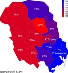| Keywords: Telemark-2000 Nynorsk.png en The proportion of nynorsk in primary schools in the municipalities of Telemark Norway in 2000 no Andelen nynorsk skolemål i kommunene på Telemark i 2000 own Eivindgh 2010-05-01 Data source Statistics Norway Statistisk sentralbyrå Map source Norwegian Mapping Authority Linguistic maps of Norway Maps of Telemark |