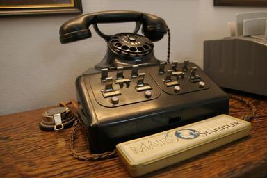 Keywords: telephone phone communication office desk workplace historically old dial keys listeners