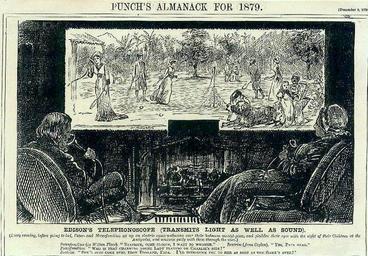 | Keywords: Telephonoscope.jpg Early television/videophone concept a forecast almanac for 1879 posted in the December 9th 1878 issue of Punch See above Punch Magazine cartoon print Edison's Telephonoscope transmits light as well as sound Every evening before going to bed Pater- and Materfamilias set up an electric camera-obscura over their bedroom mantel-piece and gladden their eyes with the sight of their children at the Antipodes and converse gaily with them through the wire Paterfamilias in Wilton Place 'Beatrice come closer I want to whisper ' Beatrice from Ceylon 'Yes Papa dear ' Paterfamilias 'Who is that charming young lady playing on Charlie's side ' Beatrice 'She's just come over from England Papa I'll introduce you to her as soon as the game's over ' George du Maurier's cartoon of 'an electric camera-obscura' is often cited as an early prediction of television and also anticipated the videophone in wide screen formats and flat screens The screen is approximately 2 metres wide and appears to have an aspect ratio of 2 7 1 the same as Ultra Panavision Artist George Du Maurier Published Almanack for 1879 PD-old Retouched page is/was http //en wikipedia org/w/index php title Image 3ATelephonoscope jpg here All following user names refer to en wikipedia 2008-11-27 02 58 Mdrejhon 480×330× 92011 bytes <nowiki></nowiki> 2008-11-27 02 49 Mdrejhon 480×330× 104273 bytes <nowiki> pd-OLD </nowiki> George du Maurier Punch magazine cartoons 1878 cartoons Videophones Telephony Television technology Albert Robida Whispering Future in art |