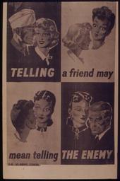 | Keywords: TELLING A FRIEND MAY MEAN TELLING AN ENEMY - NARA - 515553.tif Scope and content General notes 515553 Local identifier 44-PA-1874 Office for Emergency Management Office of War Information Domestic Operations Branch Bureau of Special Services 03/09/1943 - 09/15/1945 Still Picture Records Section Special Media Archives Services Division NWCS-S National Archives at College Park 8601 Adelphi Road College Park MD 20740-6001 1941 - 1945 Record group Record Group 44 Records of the Office of Government Reports 1932 - 1947 Record group ARC 373 World War II Posters compiled 1942 - 1945 Series ARC 513498 File unit File unit ARC Variant control numbers NAIL Control Number NWDNS-44-PA-1874 yes Other versions <gallery> File TELLING_A_FRIEND_MAY_MEAN_TELLING_AN_ENEMY_-_NARA_-_515553 tif tif File TELLING_A_FRIEND_MAY_MEAN_TELLING_AN_ENEMY_-_NARA_-_515553 jpg jpg </gallery> NARA-cooperation PD-USGov Anti-rumor propaganda World War II posters from the United States NARA TIF images with categorized JPGs |