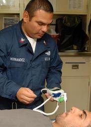 | Keywords: Temperature check aboard USS Carter Hall DVIDS131018.jpg en Hospital corpsman Petty Officer 2nd Class Sergio Hernandez takes the temperature of an Iraqi sailor aboard the amphibious dock landing ship USS Carter Hall Carter Hall is deployed as part of the Iwo Jima Expeditionary Strike Group supporting maritime security operations in the U S 5th Fleet area of responsibility 2008-11-13 https //www dvidshub net/image/131018 081113-N-+++++-003 2008-11-25 00 58 PERSIAN GULF USCENTCOM AT SEA PD-USGov-Military-Navy USS Carter Hall LSD-50 Images from US Navy location Iwo Jima Japan Images from DoD uploaded by Fæ |
