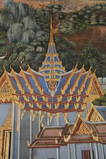 Keywords: temple painting colorful gold blue white pointed spires oriental thailand thai traditional building faith religious architecture scene artwork decorative