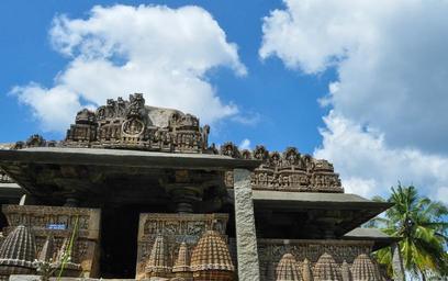 | Keywords: temples structures architecture worshipping sacred hinduism indian cultures asian exterior sculptures stone walls masonry ancient historic spiritual religious blue sky white fluffy clouds coconut trees palms natural environment peaceful scenic |