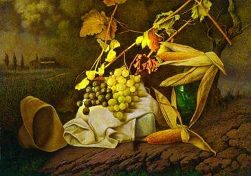 | Keywords: Temporautunno.png Artwork title Autumnal storm Temporautunno Mixed media wood 50 x 70 cm Still life in a Tuscan landscape reflecting the autumnal season showing in hyperealistic manner with strong contrast of light the evocative feeling of this season credit line Own 1970 Creator Anchise Picchi Free released by the curator of the paintings of Anchise Picchi Lido Pacciardi Other versions Paintings of grapes Anchise Picchi 1970s still-life paintings | ||||
