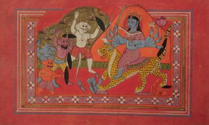 | Keywords: Ten-armed Devi annihilating demons - Unknown, Kashmir School - Google Cultural Institute.jpg Ten-armed Devi annihilating demons - Unknown Miniature Painting Kashmir School - Google Cultural Institute Paper 41 x 26 cm The lion-riding ten-armed Devi holding in her hands a sword goad mace conch rosary decapitated human head tongs lotus shield and wine-cup is on charge against demons perhaps of the Raktabija clan Some already killed lay under her lion's feet while many more as if emerged out of the soil face her Roktabija had powers to recreate a new Raktabija demon out of each drop of his blood that fell on the earth Various colours of their bodies symbolise evil's various ways Devi's iconography floral border and distribution of the space into two blocks one for the goddess and other for demons are characteristic features of Kashmir style 1800 - 1820 https //www google com/culturalinstitute/asset-viewer/zwH3oB29Mhb5VQ PD-Art-100 Paintings of Durga Google Art Project works by unknown artist India Files uploaded by Yann Forget 19th-century paintings from India Academy of Fine Arts and Literature |