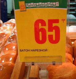 Keywords: TengeSignBread.jpg en New tenge sign at a price of a bread 65 in a market in Kazakhstan ru овый знак тенге на ценнике к хлебу в супе ма кете в Казахстане снимок сделан в Алма-Ате Own Ds02006 2009-03-09 Tenge sign 65 number Pricing