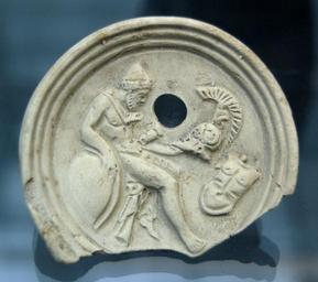 | Keywords: Terracotta Odysseus Akhilleus arms Staatliche Antikensammlungen.jpg Odysseus sinnend mit den Waffen Achills Schild Helm und Panzer Tonöllampe 1 Jh n Chr Odysseus contemplating Achilles' arms shield helmet and armour Clay oil lamp 1st century CE Ulysse contemplant les armes d'Achille bouclier casque et armure Lampe à huile en argile Ier siècle ap J -C Museum Staatliche Antikensammlungen Room 4 object history credit line accession number User Bibi Saint-Pol own work 2007-02-13 other versions Judgement of arms Ancient Roman oil lamps in Germany Ancient Greek terracottas in the Staatliche Antikensammlungen Staatliche Antikensammlungen - Room 4 1st-century pottery |