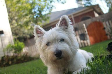 Keywords: terrier white dog animal pet canine cute mammal domestic small adorable highland purebred happy doggy backyard green grass