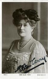 | Keywords: TWL.2002.140Postcard, printed, cardboard, monochrome photographic studio portrait of Ellen Terry, head and shoulders, wearing evening dress, white border, black text, printed inscription front: '1994 H MISS ELLEN TERRY. ROTARY PHOTO. EC', signed 'Ellen Terry' in black ink, in front right bottom corner.