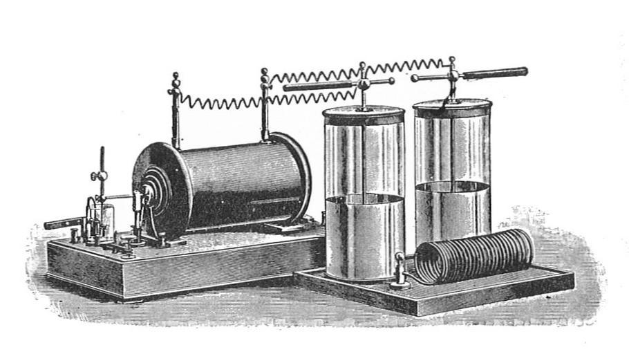 | Keywords: Tesla high-frequency apparatus (Rankin Kennedy, Electrical Installations, Vol V, 1903).jpg D'Arsonval apparatus invented by French physicist and doctor Jacque Arsene D'Arsonval around 1890 used in an obsolete Victorian-era medical field called electrotherapy It was a high frequency resonant oscillation transformer similar to a Tesla coil without the secondary winding which generated high voltage high frequency electricity It consisted of an induction coil rear that generated a high voltage of around 4 - 15 kV This repeatedly charged the two Leyden jar capacitors which repeatedly discharged with a spark through the spark gap The capacitors together with the solenoid coil front formed a tuned circuit and the spark excited damped oscillations in the tuned circuit The device produced an oscillating voltage of 20 - 30 kV with substantial current at frequencies of around 300 kHz - 5 MHz Wires from both ends of the coil to electrodes applied the current to the patient's body It was used for diathermy deep heating of tissue and several other therapies Tesla coils Electrotherapy |
