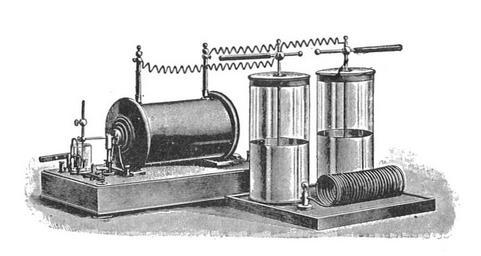 | Keywords: Tesla high-frequency equipment (Rankin Kennedy, Electrical Installations, Vol V, 1903).jpg D'Arsonval apparatus invented by French physicist and doctor Jacque Arsene D'Arsonval around 1890 used in an obsolete Victorian-era medical field called electrotherapy It was a high frequency resonant oscillation transformer similar to a Tesla coil without the secondary winding which generated high voltage high frequency electricity It consisted of an induction coil rear that generated a high voltage of around 4 - 15 kV This repeatedly charged the two Leyden jar capacitors which repeatedly discharged with a spark through the spark gap The capacitors together with the solenoid coil front formed a tuned circuit and the spark excited damped oscillations in the tuned circuit The device produced an oscillating voltage of 20 - 30 kV with substantial current at frequencies of around 300 kHz - 5 MHz Wires from both ends of the coil to electrodes applied the current to the patient's body It was used for diathermy deep heating of tissue and several other therapies Tesla coils Electrotherapy |