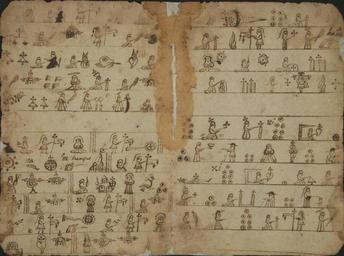 Keywords: Testerian Catechism WDL2964.jpg Artwork ru Тесте ианский катехизис fr Catéchisme testérien en Testerian Catechism zh Testerian 问答集 pt Catecismo testeriano ar كتيب تعاليم مسيحية بالرموز المصورة تستيريان ru Эта укопись начала XVI века известная как Тесте ианский катехизис является одним из наиболее п имечательных документов в а хивах Цент а по изучению исто ии ексики В анний пе иод испанского завоевания ексики до того как елигиозные наставники изучили языки местных на одов для  асп ост анения х истианского Евангелия использовались иллюст и ованные исто ии п едставляющие основное учение Це кви Такие катехизисы назывались тесте ианскими по имени отца Хакобо-де-Тесте а  ф анцисканского священника кото ый п идумал этот метод обучения <br>Католическая це ковь; Ф анцисканцы; Хакобо де Тесте а; Религиозные книги fr Ce manuscrit du début du 16ème siècle connu comme le catéchisme Testerian est l'un des documents les plus remarquables des archives du Centre pour l'Étude de l'Histoire du Mexique Au début de la conquête espagnole du Mexique avant que les instructeurs religieux n'aient appris les langues des peuples indigènes ils utilisèrent des histoires en images décrivant les enseignements de base pour diffuser l'évangile chrétien Ces catéchismes furent appelés Testerians d'après Père Jacobo de Testera un prêtre franciscain qui fut l'initiateur de cette méthode d'enseignement <br>Église catholique; Franciscains; Jacobo de Testera; Ouvrages religieux en This early-16th century manuscript known as a Testerian catechism is one of the more notable documents in the archives of the Center for the Study of the History of Mexico In the early period of the Spanish conquest of Mexico before religious instructors had learned the languages of the indigenous peoples they used pictorial stories describing basic teachings to spread the Christian Gospel These catechisms were called Testerians after Father Jacobo de Testera a Franciscan priest who pioneered this method of teaching <br>Catholic Church; Franciscans; Jacobo de Testera; Religious books zh 这份 16 世纪早 的手稿被人们称 Testerian 教义问答手册,是墨西哥历史研究中心档案中 著名的文献之 西班牙征 墨西哥早 , 宗教教师没 学会 著人民的语 前,他们使用图画故事 描绘基 的教义,传播基 教福音 这些教义问答手册被人们称为 Testerians,为的是纪念 布道事率先使用该方法的 芳济会神父 Jacobo de Testera <br>天主教会; 方济会; Jacobo de Testera; 宗教书籍 pt Este manuscrito do início de século XVI conhecido como um catecismo testeriano é um dos mais notáveis documentos dos arquivos do Centro para o Estudo da História do México No início do período da conquista espanhola do México antes que os catequistas tivessem aprendido as línguas dos povos indígenas eles utilizaram histórias pictóricas descrevendo ensinamentos básicos para difundir o evangelho cristão Estes catecismos foram chamados testerianos derivado do nome do Padre Jacobo de Testera um padre franciscano que foi pioneiro neste método de ensino <br>Igreja Católica; Franciscanos; Jacobo de Testera; Livros religiosos ar هذه المخطوطة التي ترجع إلى أوائل القرن السادس عشر والتي تعرف بالتعليم المسيحي التستيري هي من أبرز الوثائق في أرشيف مركز دراسات التاريخ المكسيكي في بداية فترة الغزو الإسباني للمكسيك، وقبل أن يتعلم أساتذة الدين لغات الشعوب الأصلية، كانوا يستخدمون القصص المصورة التي تصف التعاليم الأساسية لنشر الإنجيل وكانت هذه التعاليم تسمى بالتستيرية، نسبة إلى الأب جاكوبو دي تيستيريا، الكاهن الفرنسيسكاني الذي رود هذه الطريقة في التعليم <br>الكنيسة الكاثوليكية; الفرنسيسكان; هاكوبو دي تستيرا; الكتب الدينية es Este manuscrito de principios del siglo XVI conocido como un catecismo testeriano es uno de los más notables documentos entre los archivos del Centro de Estudios de Historia de México En los primeros tiempos de la conquista española de México antes de que los instructores religiosos hubiesen aprendido las lenguas de los pueblos indígenas se utilizaban historias pictóricas que describían las enseñanzas fundamentales para difundir el Evangelio cristiano Estos se llamaban catecismos testerianos en honor al padre Jacobo de Testera un sacerdote franciscano que fue pionero en este método de enseñanza <br>Iglesia católica; Franciscanos; Jacobo de Testera; Libros religiosos 1524 ru Рукописи fr Manuscrits en Manuscripts zh 手稿 pt Manuscritos ar مخطوطات es Manuscritos en 8 folios 15 5 x 11 centimeters ru Цент изучения исто ии ексики CARSO fr Centre d Études de l'Histoire du Mexique CEHM CARSO en Center for the Study of the History of Mexico CARSO zh 墨西哥 CARSO 历史研究中心 pt Centro de Estudos da História do México CEHM CARSO ar مركز دراسات التاريخ المكسيكي es Centro de Estudios de Historia de México CARSO object history exhibition history credit line place of creation ru ексика fr Mexique en Mexico zh 墨西哥 pt M