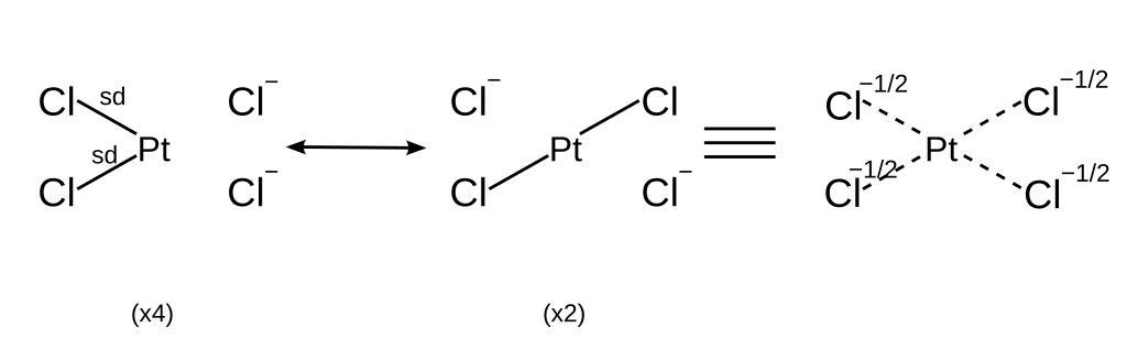 Keywords: Tetra plat.svg en Resonance structures of Tetrachloroplatinate ion with orbitals labelled own Officer781 2013-10-04 Hypervalent compounds