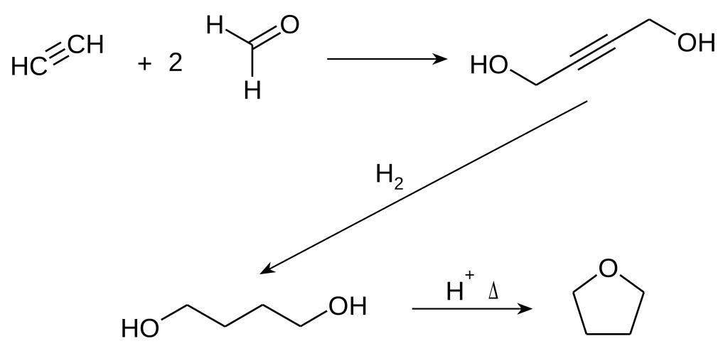 Keywords: Tetrahydrofuran synthesis01.svg en Synthesis of tetrahydrofuran Reppe process de Synthese von Tetrahydrofuran Reppe-Prozess own Steffen 962 2012-03-16 PD-chem Tetrahydrofuran Cc-zero