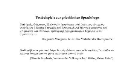 | Keywords: Textbeispiele zur griechischen Sprachfrage.svg en Samples of Katharevousa and Dimotiki Typeset in Palatino with XeLaTeX de Textbeispiele zur griechischen Sprachfrage Mit XeLaTeX in Palatino gesetzt Text <center>Textbeispiele zur griechischen Sprachfrage</center> Καὶ ὑμεῖς ὦ ἂριστοι ἐξ ὧν ὑμῖν ἐχαρίσατο οὐχὶ διά τινος εὐτυχοῦς διορύξεως ὁ Ἑρμῆς ὁ τυχαῖος καὶ ἄλογος λλὰ διὰ τῆς ἐχέφρονος καὶ ἐ ιμελοῦς καὶ ἐ ι όνου ἐμ ορικῆς ραγματείας ὁ Ἑρμῆς ὁ μετὰ τιμιότητος <br /> <div align right > Eugenios Voulgaris 1716 1806 Vertreter der Hochsprache </div> Καθαρέβουσα γιὰ οιὸ λόγο λὲν τὴ γλῶσσα τους οἱ δασκάλοι; Γιατὶ ὅλα τὰ κάμνει ἄσ ρα σὰν τὸ χιόνι αστρικὰ σὰν τὸ νερὸ <br /> <div align right > Giannis Psycharis Vertreter der Volkssprache 1888 in Meine Reise </div> own Brian Ammon 2011-12-06 File Textbeispiele zur griechischen Sprachfrage JPG Bilingualism Documents in Greek Cc-zero |