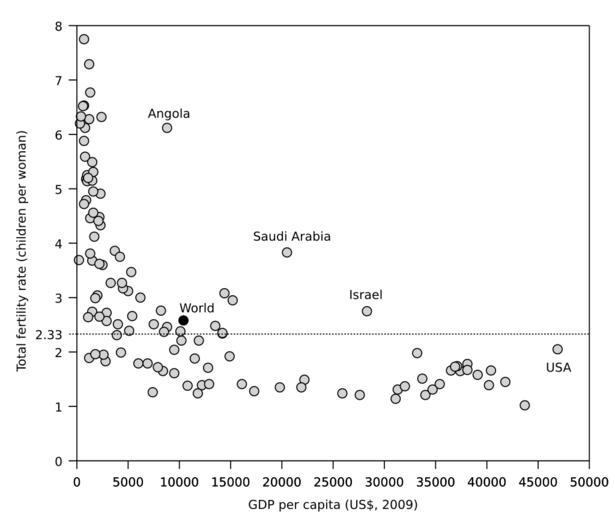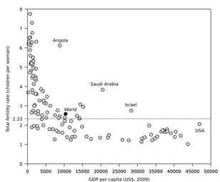 | Keywords: TFR vs PPP 2009.svg en Total Fertility Rate vs GDP per capita 2009 USD Only countries with over 5 Million population were plotted to reduce outliers own Emmanuelm wikipedia en Demmo 2009-09-21 File Fertility rate jpg Created with Text Editor Sources https //www cia gov/library/publications/the-world-factbook/ CIA - The World Factbook Population June 2009 est https //www cia gov/library/publications/the-world-factbook/rankorder/2119rank html Total fertility rate 2009 est https //www cia gov/library/publications/the-world-factbook/rankorder/2127rank html GDP per capita https //www cia gov/library/publications/the-world-factbook/rankorder/2004rank html wikitable center style background f0f0f0; __Country__ center style background f0f0f0; __Population__ center style background f0f0f0; __PPP__ center style background f0f0f0; __TFR__ - World 5000000000 10 400 00 2 58 - China 1338612968 6 000 00 1 79 - India 1166079217 2 900 00 2 72 - European Union 491582852 33 700 00 1 51 - United States 307212123 46 900 00 2 05 - Indonesia 240271522 3 900 00 2 31 - Brazil 198739269 10 200 00 2 21 - Pakistan 176242949 2 500 00 3 6 - Bangladesh 156050883 1 500 00 2 74 - Nigeria 149229090 2 300 00 4 91 - Russia 140041247 16 100 00 1 41 - Japan 127078679 34 000 00 1 21 - Mexico 111211789 14 200 00 2 34 - Philippines 97976603 3 300 00 3 27 - Vietnam 86967524 2 800 00 1 83 - Ethiopia 85237338 800 00 6 12 - Egypt 83082869 5 400 00 2 66 - Germany 82329758 35 400 00 1 41 - Turkey 76805524 11 900 00 2 21 - Congo Democratic Republic of the Zaire 68692542 300 00 6 2 - Iran 66429284 12 800 00 1 71 - Thailand 65905410 8 400 00 1 65 - France 64057792 33 200 00 1 98 - United Kingdom 61113205 36 500 00 1 66 - Italy 58126212 31 300 00 1 31 - South Africa 49052489 10 100 00 2 38 - Korea South 48508972 27 600 00 1 21 - Burma 48137741 1 200 00 1 89 - Ukraine 45700395 7 400 00 1 26 - Colombia 45644023 8 800 00 2 46 - Sudan 41087825 2 200 00 4 48 - Tanzania 41048532 1 300 00 4 46 - Argentina 40913584 14 200 00 2 35 - Spain 40525002 34 700 00 1 31 - Kenya 39002772 1 600 00 4 56 - Poland 38482919 17 300 00 1 28 - Morocco 34859364 4 000 00 2 51 - Algeria 34178188 6 900 00 1 79 - Canada 33487208 39 100 00 1 58 - Uganda 32369558 1 300 00 6 77 - Peru 29546963 8 500 00 2 37 - Iraq 28945657 3 700 00 3 86 - Saudi Arabia 28686633 20 500 00 3 83 - Nepal 28563377 1 100 00 2 64 - Afghanistan 28396000 700 00 6 53 - Uzbekistan 27606007 2 600 00 1 95 - Venezuela 26814843 13 500 00 2 48 - Malaysia 25715819 15 200 00 2 95 - Ghana 23832495 1 500 00 3 68 - Yemen 23822783 2 400 00 6 32 - Taiwan 22974347 31 100 00 1 14 - Korea North 22665345 1 800 00 1 96 - Romania 22215421 12 200 00 1 39 - Mozambique 21669278 900 00 5 18 - Sri Lanka 21324791 4 300 00 1 99 - Australia 21262641 38 100 00 1 78 - Madagascar 20653556 1 000 00 5 14 - Cote d\'Ivoire 20617068 1 700 00 4 12 - Syria 20178485 5 000 00 3 12 - Cameroon 18879301 2 300 00 4 33 - Netherlands 16715999 40 400 00 1 66 - Chile 16601707 14 900 00 1 92 - Burkina Faso 15746232 1 200 00 6 28 - Kazakhstan 15399437 11 500 00 1 88 - Niger 15306252 700 00 7 75 - Ecuador 14573101 7 500 00 2 51 - Cambodia 14494293 2 000 00 3 04 - Malawi 14268711 800 00 5 59 - Senegal 13711597 1 600 00 4 95 - Guatemala 13276517 5 300 00 3 47 - Angola 12799293 8 800 00 6 12 - Mali 12666987 1 200 00 7 29 - Zambia 11862740 1 500 00 5 15 - Cuba 11451652 9 500 00 1 61 - Zimbabwe 11392629 200 00 3 69 - Greece 10737428 32 000 00 1 37 - Portugal 10707924 22 200 00 1 49 - Tunisia 10486339 7 900 00 1 72 - Rwanda 10473282 1 000 00 5 25 - Belgium 10414336 37 400 00 1 65 - Chad 10329208 1 600 00 5 31 - Czech Republic 10211904 25 900 00 1 24 - Guinea 10057975 1 100 00 5 2 - Hungary 9905596 19 800 00 1 35 - Somalia 9832017 600 00 6 52 - Bolivia 9775246 4 500 00 3 17 - Dominican Republic 9650054 8 200 00 2 76 - Belarus 9648533 11 800 00 1 24 - Sweden 9059651 38 100 00 1 67 - Haiti 9035536 1 300 00 3 81 - Burundi 8988091 400 00 6 33 - Benin 8791832 1 500 00 5 49 - Azerbaijan 8238672 9 500 00 2 04 - Austria 8210281 40 200 00 1 39 - Honduras 7792854 4 400 00 3 27 - Switzerland 7604467 41 800 00 1 45 - Serbia 7379339 10 800 00 1 38 - Tajikistan 7349145 1 800 00 2 99 - Israel 7233701 28 300 00 2 75 - Bulgaria 7204687 12 900 00 1 41 - El Salvador 7185218 6 200 00 3 - Hong Kong 7055071 43 700 00 1 02 - Paraguay 6995655 4 200 00 3 75 - Laos 6834942 2 100 00 4 41 - Sierra Leone 6440053 700 00 5 88 - Jordan 6342948 5 100 00 2 39 - Libya 6310434 14 400 00 3 08 - Papua New Guinea 6057263 2 200 00 3 62 - Togo 6019877 900 00 4 79 - Nicaragua 5891199 2 900 00 2 57 - Eritrea 5647168 700 00 4 72 - Denmark 5500510 37 100 00 1 74 - Slovakia 5463046 21 900 00 1 35 - Kyrgyzstan 5431747 2 200 00 2 65 - Finland 5250275 36 900 00 1 73 - Demography SVG temporal graphs Gross domestic product Fertility rates |
