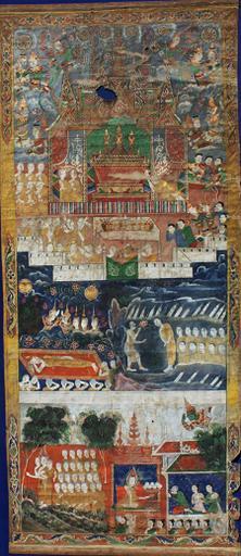 | Keywords: Thai - Death of Buddha, and Other Events - Walters 20101229.jpg Events in the painting are as follows 1 The Buddha's last meal at Cunda's home 2 Buddha is led to a forest of Sal trees belonging to the King of Mallas at Kusinara 3 The Buddha's Parinibbana 4 Kassapa Hears About The Passing Away of the Buddha 5 Kassapa at Buddha's Pyre century 19 pigments cloth cm 185 5 94 accession number 2010 12 29 81933 Ethnic East Regent Hotel Mae Rim Old Road Chiengmai Thailand Collection of James E Bogle Philadelphia Pennsylvania December 10 2002 by purchase Walters Art Museum Gift of Mr James E Bogle 2010 place of origin Thailand Walters Art Museum license 2D Thai paintings in the Walters Art Museum Art of Ancient Thailand Media contributed by the Walters Art Museum needs category review Buddhist art from Thailand |