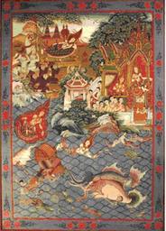 | Keywords: Thai - Mahajanaka Jataka - Walters 2010127.jpg pigments cloth cm 81 58 4 accession number 2010 12 7 81911 Connie Mascow proprietor of 'Monogram' Oriental Hotel Shopping Gallery Bangkok Thailand date and mode of acquisition unknown Collection of James E Bogle Philadelphia Pennsylvania December 20 1975 by purchase Walters Art Museum Gift of Mr James E Bogle 2010 Exhibition of Thai Paintings from James Bogle's Collection Lycoming College Gallery Williamsport 1981-2002 place of origin Thailand Walters Art Museum license 2D Thai paintings in the Walters Art Museum Art of Ancient Thailand Media contributed by the Walters Art Museum needs category review |