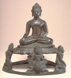 | Keywords: Thai - Seated Buddha in "Maravijaya," on Base Featuring Mara's Warriors - Walters 542744.jpg This is a Sihing-type image with certain traits that link it to the Nakhon Si Thammarat tradition a robe edge running from mantle to wrist and folded pleats spread out in front of the ankles On a separately cast base are two warriors from Mara's army at left and right with a third warrior in a splayed-leg heraldic pose at the center Between his legs is a face to which he has seemingly just given birth The original names for these figures are not known but there are other ensembles with similar representations 1st half Other date century 16 Ayutthaya leaded zinc bronze figure zinc bronze base with base and at knees cm 18 9 accession number 54 2744 29142 Dr Carthew Alexander B Griswold Monkton June 1949 presented to the Breezewood Foundation 1965 inv no 546 Walters Art Museum Henry Walters Bequest of A B Griswold 1992 none Unearthly Elegance Buddhist Art from the Griswold Collection The Walters Art Gallery Baltimore 1995 place of origin north central Thailand Walters Art Museum license Thai sculptures in the Walters Art Museum Art of Ancient Thailand Media contributed by the Walters Art Museum needs category review |