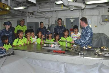 | Keywords: Thai students tour USS Frank Cable 140328-N-WC566-010.jpg en Hull Maintenance Technician 2nd Class Brandon Callow right shows students from the Mosaic School Program in Thailand objects produced in the pipe shop aboard the submarine tender USS Frank Cable AS 40 Frank Cable forward deployed to the island of Guam conducts maintenance and support of submarines and surface vessels deployed in the U S 7th Fleet area of responsibility and is currently on a scheduled underway period U S Navy photo by Mass Communication Specialist Seaman Gabrielle Joyner/Released 2014-03-28 Petty Officer 3rd Class Gabrielle Joyner https //www dvidshub net/image/1215271 140328-N-WC566-010 2014-04-02 00 39 SATTAHIP TH PD-USGov-Military-Navy Sattahip USS Frank Cable AS-40 Images from DoD uploaded by Fæ |