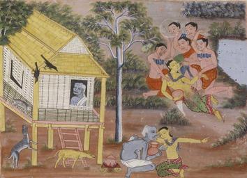 | Keywords: Thai - Vessantara Jataka, Chapter 5 (Jujaka) - Walters 35250 - A T Front.jpg The old brahmin Jujaka is poor but has a young beautiful wife named Amittatapana When Amittatapana goes to fetch water the village women mock her for being married to an old man She pleads with Jujaka to ask Vessantara for his children so that they can come and do her work and she threatens to leave her husband unless her wish is granted Amittatapana is seen getting teased and then returning to tell Jujaka her demand Jujaka is also depicted twice sitting in his small house and receiving the water from his wife ca 1920 1940 Bangkok paint cloth cm 52 5 66 5 accession number 35 250 16384 Doris Duke Charitable Foundation's Southeast Asian Art Collection date and mode of acquisition unknown Walters Art Museum Gift from Doris Duke Charitable Foundation's Southeast Asian Art Collection 2002 place of origin Thailand Walters Art Museum license 2D Vessantara Jataka Thai paintings in the Walters Art Museum Art of Ancient Thailand Media contributed by the Walters Art Museum needs category review |