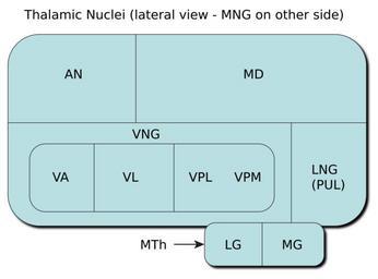 | Keywords: ThalamicNuclei.svg Thalamic nuclei MNG Midline nuclear group AN Anterior nuclear group MD Medial dorsal nucleus VNG Ventral nuclear group VA Ventral anterior nucleus VL Ventral lateral nucleus VPL Ventral posterolateral nucleus VPM Ventral posteromedial nucleus LNG Lateral nuclear group PUL Pulvinar MTh Metathalamus LG Lateral geniculate nucleus MG Medial geniculate nucleus ThalamicNuclei png 50 2012-01-22 06 39 UTC ThalamicNuclei png Arcadian derivative work Hazmat2 <span class signature-talk >talk</span> Translate Arcadian Lateral geniculate nucleus Medial geniculate nucleus Thalamus |