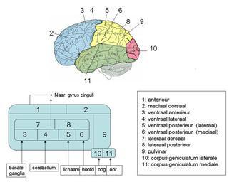 | Keywords: Thalamus.PNG nl wikipedia 2007 December 12 Linksonder schematische voorstelling van de thalamus en voornaamste specifieke kerngebieden Ook de input naar thalamus van enkele belangrijke zintuigen zien horen tast en subcorticale areae cerebellum basale ganglia is hierbij weergegeven Gebieden 1 en 2 maken vormen de mediale kerngroepen en liggen in feite meer naar 'binnen' toe in de thalamus Overige gebieden vormen de laterale aan zijkant gelegen kerngroepen Boven de gebieden in de neocortex lateraal aanzicht die met een aantal van deze kerngebieden zijn verbonden nl wikipedia 2007-01-15 Albert Kok wikipedia nl Albert Kok Original upload log page nl wikipedia Thalamus PNG 2007-01-16 11 06 Albert Kok 960×720×8 212124 bytes <nowiki></nowiki> 2007-01-15 14 12 Albert Kok 960×720×8 192399 bytes <nowiki></nowiki> Brain Thalamus |