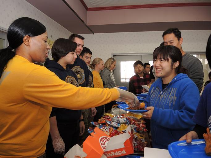| Keywords: Thanksgiving community service project 141123-N-EC644-135.jpg en Sailors assigned to Misawa Air Base Japan play soccer with children at the Bikoen Orphanage in Shichinohe Japan during a Thanksgiving Extravaganza community service project The Sailors played games and served a Thanksgiving meal to the children that included cookies turkey rice roasted pork and Popeyes chicken U S Navy photo by Senior Chief Mass Communication Specialist Ryan C Delcore/Released 2014-11-22 Senior Chief Petty Officer Ryan Delcore https //www dvidshub net/image/1680552 141123-N-EC644-135 2014-12-01 16 42 SHICHINOHE JP PD-USGov-Military-Navy Misawa Air Base Images from DoD uploaded by Fæ |