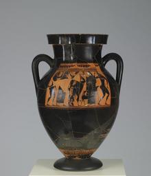 | Keywords: The Affecter - Black-Figure Amphora - Walters 4811 - Side B.jpg The vase painter known as The Affecter had a long career beginning before 550 BC and lasting into the 520s His style is one of the most easily recognized in all of Greek vase-painting characterized by thick figures with tiny heads and exaggerated angular joints Both sides of the amphora show scenes of the messenger-god Hermes leading the wine-god Dionysus towards a woman perhaps Ariadne wife of Dionysus who welcomes them in the company of satyrs ca 540 530 BC Archaic terracotta cm 60 27 accession number 48 11 28180 Don Marcello Massarenti Collection Rome no 218 Henry Walters city Baltimore Walters Art Museum Henry Walters Acquired by Henry Walters with the Massarenti Collection 1902 Undercover Stories in Art The Walters Art Gallery Baltimore 1980 place of origin Athens Greece Walters Art Museum license Ancient Greek black-figure pottery in the Walters Art Museum The Affecter Dionysos with Sileni in ancient Greek pottery Media contributed by the Walters Art Museum needs category review |