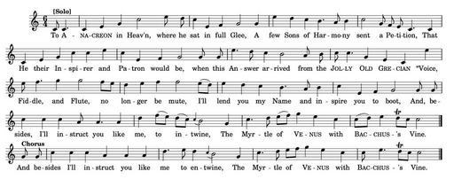| Keywords: The Anacreontic Song (corrected version).png en Melody of The Anacreontic Song from the first Longman Broderip edition c 1780 Transcribed and typeset in Lilypond by the uploader 1780 http //lcweb2 loc gov/diglib/ihas/loc natlib ihas 100000012/default html Ralph Tomlinson / Anon John Stafford Smith other versions Generated from the following Lilypond source with the command <code>lilypond anacr ly</code> <pre> version 2 18 2 set-default-paper-size a4 'landscape myMelody c8 \markup \bold Solo c4 c4 e4 g4 c2 e8 d8 c4 e 4 f4 g2 g4 e'4 d4 c4 b4 a8 b4 c2 g8 f8 e8 c4 c4 \break c4 e4 g4 c4 c4 e4 c4 e 4 f4 g2 g8 g8 e'4 d8 c4 b2 a8 b8 c8 c4 g4 e4 c4 e'4 \break e8 f4 g4 g2 f8 e8 d4 e4 f4 f2 e8 d8 e4 d4 c4 b4 a8 b4 c4 e 4 f4 g2 g8 g8 \break c4 c4 c4 a8 a4 a4 d4 f8 e8 d8 c8 \appoggiatura c4 b2 g4 c4 d8 e8 f8 g4 e4 c4 c8 d8 e4 d8\trill c8 c2 \bar \break g8 \markup \bold Chorus g8 c4 c4 c4 a4 a4 a4 d4 e8 d4 \appoggiatura c4 b2 g4 c4 d8 e8 f8 g4 e4 c4 c8 e4 d8\trill c8 c2 \bar myLyrics \lyricmode To \markup\smallCaps A -- \markup\smallCaps na -- \markup\smallCaps creon in Heav'n where he sat in full Glee A few Sons of Har -- mo -- ny sent a Pe -- ti -- tion That He their In -- spi -- rer and Pa -- tron would be when this An -- swer ar -- rived from the \markup\smallCaps Jol -- \markup\smallCaps ly \markup\smallCaps Old \markup\smallCaps Gre -- \markup\smallCaps cian Voice Fid -- dle and Flute no lon -- ger be mute I'll lend you my Name and in -- spire you to boot And be -- sides I'll in -- struct you like me to in -- twine The Myr -- tle of \markup\smallCaps Ve -- \markup\smallCaps nus with \markup\smallCaps Bac -- \markup\smallCaps chus -- 's Vine And be -- sides I'll in -- struct you like me to en -- twine The Myr -- tle of \markup\smallCaps Ve -- \markup\smallCaps nus with \markup\smallCaps Bac -- \markup\smallCaps chus -- 's Vine PUTTING IT ALL TOGETHER anacrMelody \autoBeamOff \time 6/4 \key c \major \partial 2 \relative c' \myMelody anacrLyrics \set associatedVoice anacrMelody \myLyrics allMelody \new Voice melody \anacrMelody allLyrics \new Lyrics \lyricsto melody \anacrLyrics anacrStaff \new Staff << \allMelody \allLyrics >> disableBarNumbers \context Score \applyContext set-bar-number-visibility 1000 anacrScore \score << \disableBarNumbers \anacrStaff >> anacrBook \book \header tagline remove footer \anacrScore \anacrBook END </pre> PD-old-100-1923 Uploaded with UploadWizard To Anacreon in Heaven |
