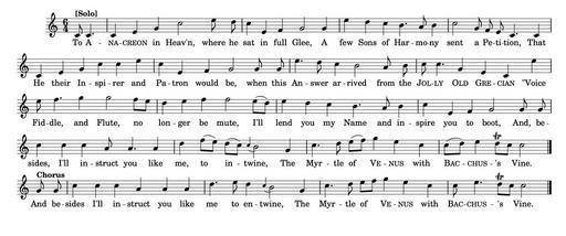 | Keywords: The Anacreontic Song.png en Melody of The Anacreontic Song from the first Longman Broderip edition c 1780 Transcribed and typeset in Lilypond by the uploader 1780 http //lcweb2 loc gov/diglib/ihas/loc natlib ihas 100000012/default html Ralph Tomlinson / Anon John Stafford Smith other versions Generated from the following Lilypond source with the command <code>lilypond anacr ly</code> <pre> \version 2 18 2 set-default-paper-size a4 'landscape myMelody c8 \markup \bold Solo c4 c4 e4 g4 c2 e8 d8 c4 e 4 f4 g2 g4 e'4 d4 c4 b4 a8 b4 c2 g8 f8 e8 c4 c4 \break c4 e4 g4 c4 c4 e4 c4 e 4 f4 g2 g8 g8 e'4 d8 c4 b2 a8 b8 c8 c4 g4 e4 c4 e'4 \break e8 f4 g4 g2 f8 e8 d4 e4 f4 f2 e8 d8 e4 d4 c4 b4 a8 b4 c4 e 4 f4 g2 g8 g8 \break c4 c4 c4 a8 a4 a4 d4 f8 e8 d8 c8 \appoggiatura c4 b2 g4 c4 d8 e8 f8 g4 e4 c4 c8 d8 e4 d8\trill c8 c2 \bar \break g8 \markup \bold Chorus g8 c4 c4 c4 a4 a4 a4 d4 e8 d4 \appoggiatura c4 b2 g4 c4 d8 e8 f8 g4 e4 c4 c8 e4 d8\trill c8 c2 \bar myLyrics \lyricmode To \markup\smallCaps A -- \markup\smallCaps na -- \markup\smallCaps creon in Heav'n where he sat in full Glee A few Sons of Har -- mo -- ny sent a Pe -- ti -- tion That He their In -- spi -- rer and Pa -- tron would be when this An -- swer ar -- rived from the \markup\smallCaps Jol -- \markup\smallCaps ly \markup\smallCaps Old \markup\smallCaps Gre -- \markup\smallCaps cian \ Voice Fid -- dle and Flute no lon -- ger be mute I'll lend you my Name and in -- spire you to boot And be -- sides I'll in -- struct you like me to in -- twine The Myr -- tle of \markup\smallCaps Ve -- \markup\smallCaps nus with \markup\smallCaps Bac -- \markup\smallCaps chus -- 's Vine And be -- sides I'll in -- struct you like me to en -- twine The Myr -- tle of \markup\smallCaps Ve -- \markup\smallCaps nus with \markup\smallCaps Bac -- \markup\smallCaps chus -- 's Vine PUTTING IT ALL TOGETHER anacrMelody \autoBeamOff \time 6/4 \key c \major \partial 2 \relative c' \myMelody anacrLyrics \set associatedVoice anacrMelody \myLyrics allMelody \new Voice melody \anacrMelody allLyrics \new Lyrics \lyricsto melody \anacrLyrics anacrStaff \new Staff << \allMelody \allLyrics >> disableBarNumbers \context Score \applyContext set-bar-number-visibility 1000 anacrScore \score << \disableBarNumbers \anacrStaff >> anacrBook \book \header tagline remove footer \anacrScore \anacrBook END </pre> PD-old-100-1923 Uploaded with UploadWizard To Anacreon in Heaven |