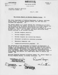 | Keywords: The Annual Report on Nuclear Weapons Surety - NARA - 198337.tif Scope and content General notes 198337 Local identifier President 1981-1989 Reagan National Security Council 1981 - 1989 Ronald Reagan Library NLRR 40 Presidential Drive Simi Valley CA 93065-0600 1986-07-08 Record group Collection RR-NSC Numbered National Security Policy Papers 1981 - 1989 Record group ARC 1189 National Security Decision Directives compiled 02/25/1981 - 01/19/1989 Series ARC 198166 File unit File unit ARC Variant control numbers NAIL Control Number NLS-NSC-NSDD-230 yes Other versions <gallery> File The_Annual_Report_on_Nuclear_Weapons_Surety_-_NARA_-_198337 tif tif File The_Annual_Report_on_Nuclear_Weapons_Surety_-_NARA_-_198337 jpg jpg </gallery> NARA-cooperation PD-USGov Presidential Decision Directives Reagan NARA TIF images with categorized JPGs |