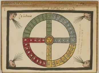 | Keywords: The Aztec Tonalpohualli Calendar WDL6732.png Artwork ru Това Хуан де около 1546 г около 1626 г fr Tovar Jean de 1546-1626 env en Tovar Juan de circa 1546-circa 1626 zh 胡安·德·托瓦尔,约 1546 年 - 约 1626 年 pt Tovar Juan de por volta de 1546-por volta de 1626 ar خوان دو توفار، حوالي 1546-حوالي 1626 es Tovar Juan de circa 1546-circa 1626 ru Ацтекский календа ь тональпоуалли счет дней fr Le calendrier Tonalpohualli aztèque en The Aztec Tonalpohualli Calendar zh 阿兹特克神 历 pt O calendário asteca Tonalpohualli ar تقويم تونالبوالي الخاص بالأزتك ru Кодекс Това а авто ом кото ого считается мексиканский иезуит XVI века Хуан де Това соде жит под обную инфо мацию об об ядах и це емониях ацтеков известных также как мешика Кодекс п оиллюст и ован 51 аква ельным исунком на полную ст аницу Рисунки в кото ых наблюдается значительное влияние пиктог афических укописей доколониальных в емен обладают исключительными художественными достоинствами Рукопись состоит из т ех азделов В пе вом азделе описана исто ия путешествий ацтеков до п ибытия испанцев Вто ой аздел п едставляет собой иллюст и ованную исто ию ацтеков В т етьем азделе находится календа ь Това а в кото ом п ослеживается календа ный цикл ацтеков с месяцами неделями днями воск есными буквами и елигиозными п аздниками х истианского 365-дневного года а этой иллюст ации из т етьего аздела изоб ажен календа ь ацтеков тональпоуалли с солнцем в цент е колеса Ацтеки использовали два календа я для исчисления дней в году Шиупоуалли пе вый или солнечный календа ь состоял из 365 дней азделенных на 18 месяцев по 20 дней в каждом плюс дополнительные пять пустых или несчастливых дней в конце года Тональпоуалли вто ой календа ь счет дней имел цикл состоящий из 260 дней кото ые п едставляли собой сочетание 13 чисел и 20 символов Во вто ой календа ь входило четы е части <em>acatl </em> т остник <em>tochtli</em> к олик <em>calli </em> дом и <em>tecpatl</em> к емень Часть календа ного к уга под названием acatl изоб ажается зеленым цветом ая Тамоанчан ацтекский аналог Эдемского сада и олицетво яет восток Часть к уга под названием tochtli изоб ажается голубым и олицетво яет юг Часть к уга под названием calli изоб ажается белым цветом художник использовал желтый и олицетво яет запад Часть к уга под названием tecpatl изоб ажается цветом же твоп иношения то есть к асным и олицетво яет севе <br>Календа ь ацтеков; Ацтеки; Календа и; Кодекс; Индейцы ексики; Ко енные на одности; езоаме ика; Кодекс Това а fr Le codex Tovar attribué à Jean de Tovar jésuite mexicain du XVI<sup>e</sup> siècle contient des informations détaillées sur les rites et les cérémonies des Aztèques également connus sous le nom de Mexicas Il est illustré de 51 aquarelles de la taille d'une page Fortement influencées par les manuscrits pictographiques de la période précontact ces peintures sont d'une qualité artistique exceptionnelle Le manuscrit est divisé en trois sections La première section contient une histoire des voyages des Aztèques avant l'arrivée des Espagnols La deuxième section est une histoire illustrée des Aztèques Dans la troisième section le calendrier de Tovar transcrit un calendrier aztèque continu avec les mois les semaines les jours les lettres dominicales et les fêtes liturgiques d'une année chrétienne de 365 jours Cette illustration extraite de la troisième section représente le calendrier Tonalpohualli aztèque avec un soleil au centre de la roue Les Aztèques utilisaient deux calendriers pour calculer les jours de l'année Comportant 365 jours Xiuhpohualli premier calendrier également appelé solaire était divisé en 18 mois de 20 jours chacun plus une période supplémentaire de cinq jours épagomènes ou néfastes à la fin de l'année Tonalpohualli second calendrier également appelé « nombre de jours » était constitué d'un cycle de 260 jours combinant 13 nombres et 20 symboles Le second calendrier était divisé en quatre parties <em>acatl </em> roseau <em>tochtli</em> lapin <em>calli </em> maison et <em>tecpatl</em> silex La partie de l'acatl de la roue du calendrier est verte couleur du paradis de Tamoanchan équivalent aztèque du jardin d'Éden et représente l'est La partie du tochtli en bleu représente le sud La partie du calli est blanche ici l'artiste a utilisé le jaune et représente l'ouest Enfin la partie du tecpatl est rouge couleur du sacrifice 