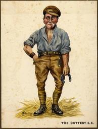 Keywords: university of victoria universityofvictoria uvic great britain. army. royal regiment of artillery greatbritainarmyroyalregimentofartillery caricatures and cartoons--20th century caricaturesandcartoons20thcentury notebooks war artists warartists world war, 1914-1918--pictorial works worldwar19141918pictorialworks world war, 1914-1918--caricatures and cartoons worldwar19141918caricaturesandcartoons people outdoor photo border Item is one of 123 pen-and-ink drawings and watercolours from two volumes titled: "Sketches of the War: France/Belgium". The sketches vary from satirical cartoons to more detailed and naturalistic renditions. They are often accompanied by an ironic title and are often signed with the artist's initials, "J.M." The artist's satirical targets include the officers and high command of both combatant sides; the disjuncture between reported and actual events, and the death of civilians as a fact of modern warfare. Item is one of 123 pen-and-ink drawings and watercolours from two volumes titled: "Sketches of the War: France/Belgium". The sketches vary from satirical cartoons to more detailed and naturalistic renditions. They are often accompanied by an ironic title and are often signed with the artist's initials, "J.M." The artist's satirical targets include the officers and high command of both combatant sides; the disjuncture between reported and actual events, and the death of civilians as a fact of modern warfare.