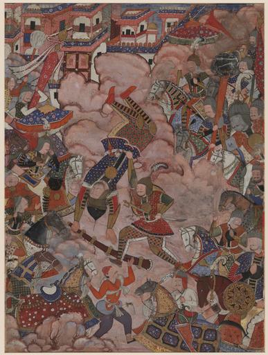 | Keywords: The battle of Mazandaran.jpg Assessments 1 Battle of Mazandaran 1 ØÙ…زه ŒÙ†Ø§Ù…Ù‡ verso describes the Battle of Mazandaran The text is executed in black nasta'liq script on a large beige sheet of paper that bears substantial water damage The last three lines also exhibit the crowded writing that is seen frequently in the manuscript as the scribe s struggled to complete the narrative account on each text page http //hdl loc gov/loc amed/ascs 238 Library of Congress Unknown Calligrapher ca 1564-1579 PD-Art thumb left Verso Military history of the Safavid dynasty Mazandaran Province Library of Congress Arabic Persian and Ottoman calligraphy collection 16th-century Mughal miniatures Akbar's Hamzanama |