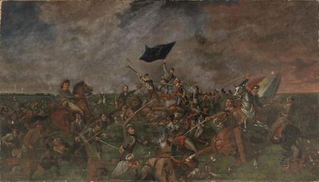 | Keywords: The Battle of San Jacinto (1901).jpg Artwork Creator Henry Arthur McArdle Artistic interpretation of the Battle of San Jacinto Caption COURTESY OF HERITAGE AUCTIONS The Battle of San Jacinto created in 1901 by H A McArdle of San Antonio is a smaller version of the mural he painted in the Texas Capitol 1901 Oil on canvas cm 121 9 213 4 object history H A McArdle;<br/>By descent to Marie McArdle;<br/>By descent to George Bland;<br/>By descent to Elisabeth Bland 1 http //media star-telegram com/smedia/2010/03/27/23/0328_bud_bulldog ART_GUU12A50M 1+San_Jacinto_painting standalone prod_affiliate 58 jpg image and http //www star-telegram com/2010/03/27/2071797/long-lost-texas-artwork-is-discovered html news article Bud Kennedy Long-lost Texas artwork is discovered Fort Worth Star-Telegram 2010-03-27<br/>2 http //fineart ha com/itm/fine-art-painting/henry-arthur-harry-mcardle-american-1836-1908-the-battle-of-san-jacinto-1901-oil-on-canvas/a/5050-76013 s Heritage Auctions Nov 20 2010 lot 76013 Other versions PD-old-100 Henry Arthur McArdle Battle of San Jacinto 1901 paintings McArdle Paintings of battles 1836 Images from Heritage Auctions Paintings of Texas |