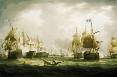 | Keywords: The Battle of Trafalgar, 21 October 1805, beginning of the action.jpg en 'The Battle of Trafalgar 21 October 1805 beginning of the action' oil on canvas by Thomas Buttersworth In the right foreground is the French ship ˜Bucentaure ™ in starboard-bow view with her mizzen mast and main topgallant mast shot away In port-bow view and passing astern of her is the British ˜Neptune ™ delivering raking fire Astern of her and only half in the picture is the ˜Leviathan ™ port bow view In the left foreground the ˜Santissima Trinidad ™ is shown in port bow view Her main and mizzen masts and fore-topgallant mast are being shot away by the ˜Victory ™ which is passing astern of her as she breaks the line Only her stern in port-quarter view can be seen and her mizzen topmast is falling Beyond her also in port-quarter view is the ˜Redoutable ™ with the ˜Téméraire ™s stern seen on her starboard side the latter also engaged with the Spanish ˜Neptuno ™ In the centre background is the ˜Euryalus ™ frigate in port-quarter view and the bow of the ˜Royal Sovereign ™ can be seen as she breaks the line astern of the ˜Santa Ana ™ in starboard-bow view losing her main topmast A mast and top with a yard and sail is in the water in the centre foreground Buttersworth painted this as one of a pair the other depicts the storm after the battle http //www nmm ac uk/collections/nelson/viewRepro cfm reproID BHC0553 picture 1 content Collections of the National Maritime Museum Creator Thomas Buttersworth date pre-1842 PD-old-100 ImageNote 1 396 75 88 217 560 369 2 Bucentaure ImageNoteEnd 1 ImageNote 2 334 122 113 168 560 369 2 HMS Neptune ImageNoteEnd 2 ImageNote 3 514 150 45 136 560 369 2 HMS Leviathan ImageNoteEnd 3 ImageNote 4 4 85 113 204 560 369 2 Santissima Trinidad ImageNoteEnd 4 ImageNote 5 49 132 130 158 560 369 2 HMS Victory ImageNoteEnd 5 Paintings of the Battle of Trafalgar Thomas Buttersworth Ships under sail |