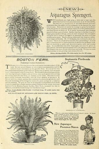Keywords: The best homes in America plant my flowers, why not you? (16201904310).jpg ASPAKAGUS SPRE GERI <br> -»fr 4 n e vv 4-j-g- <br> Asparagus Sprengeri <br> WHEN introduced at a high price a little over a year ago this <br> plant was received with some hesitation as to its desirability <br> but after on'y a limited trial it has come forward with such <br> prominence that the supply will be inadequate to the demand for some <br> time to come Not only is it useful for cutting in sprays for cut-flower <br> work but grown in suspended pots it makes one of the prettiest decora- <br> tive house plants we know of It is really handsomest seen drooping <br> gracefully from a pot or basket Sprays from four to five feet long of a <br> bright green feathery foliage and as it will withstand dry atmosphere <br> and grow well ia shade or sunlight it is decidedly the most useful and <br> suitable parlor plant The flowers are white and very fragrant follow- <br> ed by bright red berries Mr H H Battles the well-known floral art- <br> ist says Grow all you possibly can of it; it's a grand thing It is not <br> only a plant that will be used extensively by florists for cut-flower work <br> but it is decidedly a useful and decorative parlor table and window <br> plant It is hardier than any other Asparagus can even be grown in <br> open ground and under good treatment will r ake specimens four to five <br> feet across in one year ” plants which have sold at 5 We have so much <br> faith in it that we are growing 10 000 plants of it now <br> Price strong plants 15 cents each; two for 25 cents <br> BOSTON F£RN <br> Nephrolepis Exaltata Bostoniensis <br> THIS grar d new Fern has become the most popular decorative plant of the <br> year In and around Boston no other plant is so extensively -used for <br> table or window decoration as this graceful Fern It is one of the very <br> few plants that will thrive under ordinary house care; it grows and improves <br> in size; where most all other Ferns go back The fronds droop and arch gracefully <br> over the edge of a pot or basket and as it is a very rapid grower it is not long <br> beiore they reach the floor from an ordinary parlor table The color is a rich <br> green which contrasts beautlfiflly with all other window or pot plants It <br> thiives well in a shady position but must never be allowed to get too dry and <br> frequent showerings of the foliage by means of a plant syringe or a watering <br> can are essential To give an idea of the magnificent proportions of this Fern <br> it may be stated that a single-specimen plant exhibited at the recent American <br> Institute Fair in Madison Square Garden New York measured ten feet in <br> diameter some of the fronds being over four feet in length <br> Price large plants with fronds 11-2 feet long 15 cents each; two <br> for 25 cents <br> ONE PLANT EACH OP ASPARAGUS AND BOSTON FERN 25 CENTS <br> Stephanotis Floribunda <br> BOSTON TURN <br> STEPHANOTIS FLORIBUNDA <br> This is a rare plant indeed that all should grow It bears <br> large clusters of pure white flowers <br> that are as fragrant as a jRsmine <br> Nothingsweeterorfiner Price 15 <br> cents each; large fine plants <br> three feet high for 40 cents <br> New Asparagus <br> Plumosus Nanus <br> This graceful climhing plant has <br> to a great extent taken the place of <br> the once popular Smilax in all tine <br> decoration s It possesses the advan- <br> tage of being much more graceful ” <br> its foli age being finer than that of the <br> most delicate Fern and will last for <br> weeks after being cu f the whole <br> plant being of a bright cheerful <br> green It is an excel 1 en t house plant <br> succeeding under almost anv con- <br> ditions Price 15 cents each 41847003 130961 64578 Text http //www biodiversitylibrary org/page/41847003 1899 10 5962/bhl title 64578 Ella V Baines Firm ; Henry G Gilbert Nursery and Seed Trade Catalog Collection NameFound Asparagus NameConfirmed Asparagus var pygmaeus Makino EOLID 10487111 NameFound Floribunda NameConfirmed Floribunda EOLID 5190123 NameBankID 3474597 NameFound Nanus NameConfirmed Nanus EOLID 73713 NameBankID 2610066 NameFound Nephrolepis NameConfirmed Nephrolepis EOLID 61678 NameBankID 2644730 NameFound Smilax NameConfirmed Smilax Jorge08 EOLID 3396175 NameFound Stephanotis NameConfirmed Stephanotis EOLID 5328337 NameBankID 3425133 NameFound Stephanotis floribunda NameConfirmed Stephanotis floribunda EOLID 5328953 NameBankID 3425237 Biodiversity Heritage Library Miss Ella V Baines the Woman Florist Springfield Ohio The best homes in America plant my flowers why not you Garden Stories Bulbs Plants Catalogs Flowers Plants Ornamental Seed industry and trade Seeds Trade catalogs U S Department of Agriculture National Agricultural Library bhl page 41847003 dc identifier http //biodiversitylibrary org/page/41847003 bhlGardenStories BHLinbloom bulbs plants plants ornamental u s department of agriculture national agricultural library bhlgardenstories bhlinbloom Information field Flickr posted date ISOdate 2015-01-28 CC-BY-2 0 BioDivLibrary https //flickr com/photos/61021753 N02/16201904310 2015-08-24 07 52 11 cc-by-2 0 PD-old-70-1923 Photos uploaded from Flickr by Fæ using a script The best homes in America The best homes in America plant my flowers, why not you? (16201904310).jpg ASPAKAGUS SPRE GERI <br> -»fr 4 n e vv 4-j-g- <br> Asparagus Sprengeri <br> WHEN introduced at a high price a little over a year ago this <br> plant was received with some hesitation as to its desirability <br> but after on'y a limited trial it has come forward with such <br> prominence that the supply will be inadequate to the demand for some <br> time to come Not only is it useful for cutting in sprays for cut-flower <br> work but grown in suspended pots it makes one of the prettiest decora- <br> tive house plants we know of It is really handsomest seen drooping <br> gracefully from a pot or basket Sprays from four to five feet lon