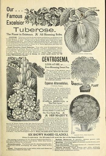 | Keywords: The best homes in America plant my flowers, why not you? (16363402786).jpg Our <br> Famous <br> Excelsior <br> Tuberose <br> The Finest in Existence 2C All Blooming Bulbs <br> CULTURE Tuberoses may be grown indoors preliminary to planting them <br> in open ground Plant outdoors as soon as the ground becomes warm and all <br> danger of frost is past Plant two or three inches deep and six to eight <br> inches apart in the row They like rich soil and plenty of sun If there is dan- <br> ger of frost before the flowers are done blooming in the Fall lift carefully with <br> earth on the roots pant in pots or boxes in a warm light place and they will <br> continue to bloom for several weeks <br> Dwarf Excelsior Pearl Tuberose Year after year its popularity has in- <br> creased uiuil the demand for it has reached enormous proportions Grows <br> about eighteen inches high blooms early and with the greatest freedom; ma- <br> tures perfectly Flowers pure white very double ot immense size and intense- <br> ly sweet This is the finest of all Tuberoses Price fine extra-large <br> -well-ripened bulbs all sure to bloom 10 cents each; three for 25 <br> cents; 75 cents per dozen <br> ENTRQSEMA <br> LOOK/ATVME or <br> Ever -Blooming Sweet Pea <br> This is one of the greatest novel- <br> ties Will grow six to eight feet <br> high or by cutting back will form a <br> lonely bush The flowers which are <br> produced in profusion are deep bine <br> and very fragrant Blooms all Sum- <br> mer Price 10 cents each; seed <br> 10 cents per packet <br> Cyperus Alternafolius <br> Umbrella Plant <br> This is a plant of the easiest culture <br> and a large specimen is as handsome as <br> a Palm for decoration It makes a hand- <br> some pot plant or can be used in bas- <br> kets or vases making a charming effect <br> It will growluxuriantly in water and <br> is therefore indispensable for aqua- <br> riums or fountains Price 10 cts <br> each; three for 25 cents <br> STAPELIA SERPENTINA or <br> Star Fish Cactus <br> The flowers are the shape of a star <br> fish of achrome-yellow color cover- <br> ed with brown spots like a ser- <br> pent's body hence its name Price <br> strong plants 6 cents each <br> The New Hardy Pink X <br> X HER MAJESTY <br> The Carnation of late has become <br> the most popular cut flower with the <br> exception of the Rose and the one <br> drawback to its cultivation by the <br> masses of flower lovers is the fact that it is not quite hardy We have at last a perfect <br> substitute for it in th s grand new and hardy Pink one of trie finest novelties of the cen- <br> tury It is quite hardy needs no protection and blooms profusely in the months of May <br> and June The flowers are pure white in color very double borne on long stiff stems <br> and possessing the exquisite ciove-scented fragrance of the true Carnations while it <br> rivals them in size and subtance It is a wonderful bloomer producing immense masses <br> of flowers You will be delighted with it Price 10 cents each; three for 25 cents <br> LOOMING SWEET PEA <br> SIX SHOWY NAMED GLADIOLI <br> HARDY PINK HER MAJESTY <br> Price 5 cents each For 25 cents I will send the Set of Six Named Gladioli <br> For massing or grouping the Six Named Gladioli described he- <br> low will be found very effective and showy while they furnish <br> fine spikes ot bloom for cut flowers <br> Brettchleyensis The flowers are of a dazzling scarlet color <br> of good size almost enveloping the entire spike which is very <br> long <br> Ceres The ground color is pure white while each flower has <br> a conspicuous blotch of violet rose <br> grower with <br> Madame Monneret A splendid vigorous <br> great spikes ot delicate rose colored flowers <br> Romulus Fine large spikes of intensely scarlet flowers each <br> with a clear white throat <br> Isaac Buchanan Very large flowers of a beautiful canary <br> yeuow borne on a splendid spike <br> Charles Dickens Large flowers pure white strikingly <br> marked with carmine Planted with the varieties described <br> above forms an attractive contrast 41846967 130961 64578 Text http //www biodiversitylibrary org/page/41846967 1899 10 5962/bhl title 64578 Ella V Baines Firm ; Henry G Gilbert Nursery and Seed Trade Catalog Collection NameFound Cyperus NameConfirmed Cyperus EOLID 29130 NameBankID 2576446 NameFound Stapelia serpentina NameConfirmed Styela serpentina Sluiter 1912 EOLID 503477 Biodiversity Heritage Library Miss Ella V Baines the Woman Florist Springfield Ohio The best homes in America plant my flowers why not you Garden Stories Bulbs Plants Catalogs Flowers Plants Ornamental Seed industry and trade Seeds Trade catalogs U S Department of Agriculture National Agricultural Library bhl page 41846967 dc identifier http //biodiversitylibrary org/page/41846967 bhlGardenStories BHLinbloom bulbs plants plants ornamental u s department of agriculture national agricultural library bhlgardenstories bhlinbloom Information field Flickr posted date ISOdate 2015-01-28 CC-BY-2 0 BioDivLibrary https //flickr com/photos/61021753 N02/16363402786 2015-08-25 03 52 47 cc-by-2 0 PD-old-70-1923 The best homes in America Photos uploaded from Flickr by Fæ using a script The best homes in America plant my flowers, why not you? (16363402786).jpg Our <br> Famous <br> Excelsior <br> Tuberose <br> The Finest in Existence 2C All Blooming Bulbs <br> CULTURE Tuberoses may be grown indoors preliminary to planting them <br> in open ground Plant outdoors as soon as the ground becomes warm and all <br> danger of frost is past Plant two or three inches deep and six to eight <br> inches apart in the row They like rich soil and plenty of sun If there is dan- <br> ger of frost before the flowers are done blooming in the Fall lift carefully with <br> earth on the roots pant in pots or boxes in a warm light place and they will <br> continue to bloom for several weeks <br> Dwarf Excelsior Pearl Tuberose Year after year its popularity has in- <br> creased u
