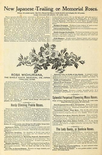 | Keywords: The best homes in America plant my flowers, why not you? (16203152099).jpg New Japanese Trailing or Memorial Roses <br> Price 10 cents each; the five Memorial <br> Large two-year-old <br> These valuable Hybrids of the well-known W'Churiana Rose <br> are first offered for sa'e this year and are novelties of sterling <br> merit Those who are familiar with the good qualities of the <br> sing e white Rose Wichuriana will he glad to obtain these beauti- <br> ful Hvbrids of the Wichuriana Rose which are of great value in <br> ornamental gardening on account of its beautiful foliage These <br> new varieties will make this class of Roses still more valuable <br> is three of them are double the flowers of one being white <br> another rose color another shell pink while the single variety <br> s a bright pink the whole forming the most remarKable group <br> of Roses The flowers are produced in the greatest profusion <br> and as the plants are extremely vigorous a plant two or three <br> years old will produce thousands of the most exquisite flowers <br> deliciouslv fragrant and lasting a longtime in perfection <br> While the growth is creeping and indispensable for covering <br> the ground in ornamental gardening the plants are also adapted <br> for training on trunks of trees pillars posts trellises or any <br> other purpose for which a climbing Rose is desirable The <br> double varieties on account of the freedom Tith which they <br> Roses both double and single for 40 cents <br> plants 40 cents each <br> bloom -will be valuable for cut flowers and will also prove of <br> exceptional value for pot plants for Spring sale It is thought <br> that they will be as valuable for this purpose as the celebrated <br> Crimson Rambler We shall be very much disappointed if <br> these new Hybrids do not obtain a commanding position among- <br> Roses <br> Manda'S Trittmph Produces large clusters of well-formed <br> double flowers of pure white two inches in diameter <br> Universal Favorite Double flowers of a beautiful rose color <br> over two inches in diameter <br> South Orange Perfection Produces multitudes of the most <br> perfectly formed double flowers about one and a half inches in <br> diameter soft blush pink at the tips changing into white and <br> lasting a long time in perfection <br> Pink Roamer Single varietv; flowers nearly two inches in <br> diameter; brighi rich pink with almost white center and orange- <br> red stamens <br> ROSA WICHURIANA <br> THE SINGLE WHITE MEMORIAL OR JAPAN <br> TRAILING ROSE <br> A trailing species of very rapid growth creeping on the ground <br> almost as closely as the Ivy For covering the ground among <br> shruobery and rocks it has no equal and is of great value in <br> ornamental gardening on account of its beautiful foliage which <br> is bright reen shining as if varnished and of an almo-t ever- <br> green character remaining green ui til nearly mid-Winter <br> making it attractive at all seasons of ihe year It is especially <br> beautiful when covered wiih its long showy clusters of white <br> blossoms which are produced in the greatest profusion during <br> the entire month of July and more sparingly throughout the <br> season The flowers are single pure white fully two inches <br> across with yellow stamens and have a delicate perfume This <br> must become one of the most popular plants for parks and pri <br> vate places Price 10 cents each; large two-year-old <br> plants 40 cents each <br> Š i C <br> imbins Prairie Roses <br> These are climbing Roses that are prrfectly hardy everywhere <br> and are consequently of the greatest value They can be readily <br> trained to a height of from ten to thirty feet as they grow with <br> great vigor They bloom the second year and but once in a <br> season but are then loaded wi h splendid Roses and are among <br> the most beautiful of flowering plants At least one of these <br> hardy climbers should be found in every Rose garden no-th of <br> Tennessee The flowers are produced in large clusters When <br> it is desired to cover walls unsightly buildings etc with Roses <br> none will be found to do the work so efficiently as varieties of <br> the Prairie Rose <br> Price 10 cents each; any three for 25 cents; large two- <br> year-old plants 25 cents each <br> Baltimore Belle Pale blush vaiegnted carmine rose and <br> white very double flowers in beautiful clusters the whole plant <br> appearing a perfect mass of bloom One of the very best climb- <br> ing Rosea <br> Bennett's Seedling An Ayrshire or Scotch rose and a <br> vigorous runner; flowers are white are very double and fra- <br> grant and borne in great profusion <br> Caroline Goodrich or Running General Jacqueminot <br> This new Hardy Climbing Hybrid Tea Rose has finely iormi d <br> very double flowers and its fragrance is mo t delicious The <br> color is the same as General Jacqueminot It makes a growth of <br> from twelve to fifteen feet in a season <br> Dundee Rambler The old-fashioned Scotch Climbing Rose <br> Entirely hardy; bears elegant rich red Roses of the largest <br> size in great profusion This we think the best of the hatdy <br> aJimbers <br> Greville or Seven Sisters Flowers in large clusters and <br> varies in color from while to crimson <br> Milledgeville or Pride of the South A splendid variety <br> Color a i ich satiny- pink very fresh and beautifuf Fine large <br> globular flowers full rtgular form very double and sweet A <br> profuse bloomer ard quite hardy <br> Pride of Washington A brilliant amaranth shaded rose <br> center large clusters and very double A fine Climber <br> Oueen of the Prairies Flowers very large and of peculiar <br> globular form A bright rosy-red changing to lighter as the <br> fljwer opens Of very stong rapid growth <br> Russell's Cottage Dark velvety crimson very double and <br> full a profuse bloomer and strong grower A very desirable <br> climbing Rnse <br> Tennessee Belle Flowers a bright beautiful pink It is