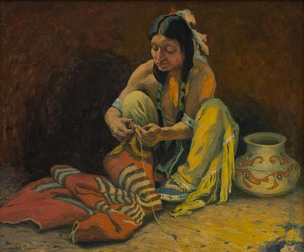 | Keywords: 'The Blanket Mender' by Eanger Irving Couse, oil on canvas, c. 1934.jpg en The Blanket Mender by Eanger Irving Couse oil on canvas c 1934 The Owings Gallery Santa Fe NM Creator Eanger Irving Couse 1934 PD-old-auto 1936 Paintings of Native Americans by Eanger Irving Couse |