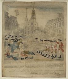 | Keywords: The Bloody Massacre Perpetrated in King Street, Boston, on March 5th 1770 by a Party of the 29th Regiment WDL214.png Artwork ru Ревие Пол 1735-1818 fr Revere Paul 1735-1818 en Revere Paul 1735-1818 zh 维尔 罗 1735-1818 pt Revere Paul 1735-1818 ar ريفير بول 1735-1818 es Revere Paul 1735-1818 ru К овавая езня на Кинг-Ст ит учинённая па тией 29-го полка Бостон 5 ма та 1770 года fr Le massacre sanglant perpétré dans King Street à Boston le 5 mars 1770 par un groupe du 29e Régiment en The Bloody Massacre Perpetrated in King Street Boston on March 5th 1770 by a Party of the 29th Regiment zh 国王街波士顿惨案,波斯顿,1770年3 5日,29团制 pt O Sangrento massacre perpetrado em King Street Boston em 5 de março de 1770 por uma parte do 29 º regimento ar المذبحة الدموية التي ارتكبت في كِنغ سْتريت، بوسطن، في 5 مارس 1770 من قبل فِرقة من الفوج التاسع عشر ru Волнения в Бостоне в конце 1760-х годов кото ые пе е осли в Аме иканскую еволюцию начались с недовольства жителей тяжким налоговым б еменем кото ому их подве гли По Актам Тауншенда 1767 г б итанцы наложили пошлины на ввоз заг аничных това ов в том числе стекла свинца к асок бумаги и чая Чтобы обеспечить соблюдение актов колонистами б итанцы увеличили военное п исутствие в ассачусетсе что п ивело к обост ению отношений между местным населением и п едставителям б итанской ко оны 5 ма та 1770 года б итанские часовые ох анявшие Бостонскую Таможню были ок ужены азгневанными бостонцами кото ыми с к иками и свистом заб осали их плотно слепленными снежками Подве гшись нападению небольшая г уппа солдат поте яла конт оль Воп еки п ямым п иказаниям не ст елять они отк ыли огонь по толпе ми ных жителей убив т оих и анив восьме ых п ичем двоих сме тельно Это сенсационное изоб ажение столкновения было п ев ащено в г авю у отпечатано и п одано будущим ге оем еволюции Полом Риви ом Риви скопи овал данный отпечаток с изоб ажения Ген и Пелхэма сделанного для опубликованной позже г авю ы под названием Плоды деспотичной власти или к овавая асп ава Г авю а Риви а вышла в свет 28 ма та 1770 года или п име но в это в емя С еди пост адавших в столкновении был аф о-аме иканский мо як К исп Аттукс <br>А мия еволюции; Аттукс К исп; К овавая езня в Бостоне; Великоб итания А мия; Солдаты; Унифо мы; Соединенные Штаты Аме ики -- Исто ия -- Революция 1775-1783 гг fr Boston à la fin des années 1760 des signes de ce qui allait devenir la Révolution américaine commencèrent à se manifester alors que montait la colère des habitants au sujet des lourds impôts auxquels ils étaient soumis Après l adoption des Townshend Acts de 1767 les Britanniques taxèrent les marchandises importées notamment le verre le plomb la peinture le papier et le thé Afin de faire appliquer ces lois ils imposèrent une forte présence militaire aux colons du Massachusetts ce qui contribua à exacerber les tensions entre la population locale et les représentants de la couronne britannique Le 5 mars 1770 les sentinelles britanniques gardant la douane de Boston furent cernées par des Bostoniens huant et lançant des boules de neige Le petit groupe de soldats perdit le contrôle de la situation lorsqu'un membre du régiment fut touché En dépit d'ordres contraires précis ils tirèrent sur une foule de civils en tuant trois et en blessant huit autres dont deux mortellement Cette représentation sensationnalisée de l'échauffourée fut gravée imprimée et vendue par le futur héros de la guerre d'Indépendance Paul Revere Celui-ci copia l'image à partir d'un dessin de Henry Pelham pour une gravure publiée ultérieurement sous le titre « The Fruits of Arbitrary Power or the Bloody Massacre » Les fruits du pouvoir arbitraire ou le massacre sanglant La gravure de Revere fut publiée vers le 28 mars 1770 Parmi les blessés se trouvait le marin afro-américain Crispus Attucks <br>Armée de la Révolution; Attucks Crispus; Massacre de Boston; Grande-Bretagne Armée; Soldats; Uniformes; États-Unis -- Histoire -- Révolution 1775-1783 en In Boston in the late 1760s the stirrings of what became the American Revolution began as residents grew angry about the heavy taxation to which they were subjected With the Townshend Acts of 1767 the British placed taxes on imported goods including glass lead paint paper and tea To enforce the acts they imposed a heavy military presence on the Massachusetts colonists that exacerbated tensions between the local populace and representatives of the crown On March 5 1770 British sentries guarding the Boston Customs House were surrounded by jeering Bostonians slinging hard-packed snowballs The small group of soldiers lost control when one of their regiment was struck Despite expl